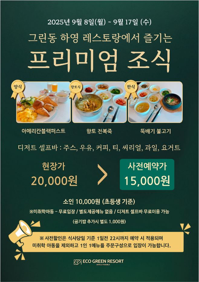 에코그린리조트에서는 고객님의 아침을 더욱 특별하게 만들어드리기 위해 조식 단품요리를 준비했답니다.
